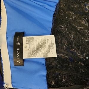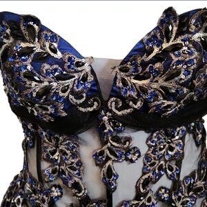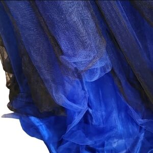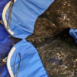 Features light catching blue gemstones, hidden back zipper, corset style peekaboo top with black boning. The top layer of skirt is a black tulle and under layers are blue. Full ballgown silhouette with a sweetheart neckline. So gorgeous on.