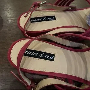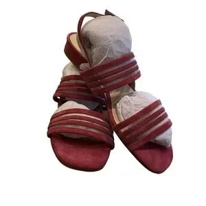 These pink sandals feature a chic strappy design with multiple horizontal straps, offering a sophisticated look. Crafted from a soft, suede-like material, they provide both comfort and style. The low block heel and ankle strap with buckle closure ensure a secure fit for any occasion.