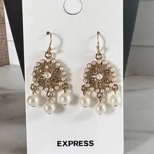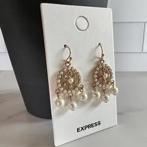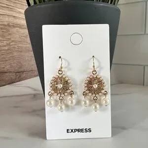 NWT Express Gold & Faux Pearl Dangle Earrings with with Wheel Shape & CZ Detail. Hook back. They’ll ship in a protective clear pouch.