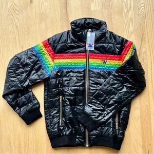 Stylish black utility jacket. Features vibrant rainbow stripes. Perfect for casual wear.