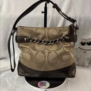 Chic Coach handbag with metallic bronze accents. Features elegant chain detail.