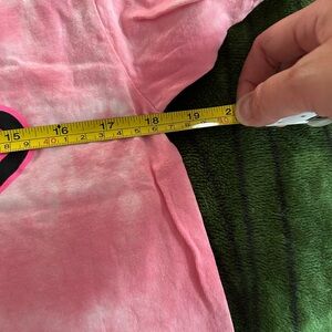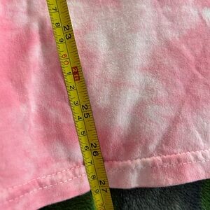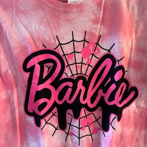 Fun Barbie Halloween graphic on a pink and white tie-dye shirt. Perfect for casual wear. Size medium, see photos for measurements.