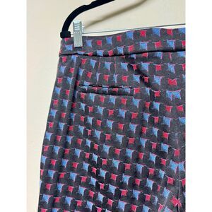 Giorgio Armani pants in geometric jacquard. Mid rise; flat front. Side slash and back besom pockets. Classic, tapered legs. Full length. Hook/zip/button front closure. Black/Red/Blue. Size Italian 50 = US 14.