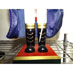 Large nutcracker holding a horn in one hand, a sword near his other hand. Cloak is blue velvet with gold ricrac trim, Bearskin hat with gold cord and red feathers.