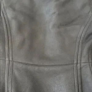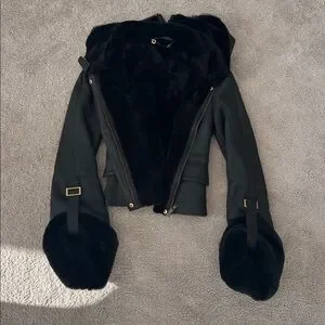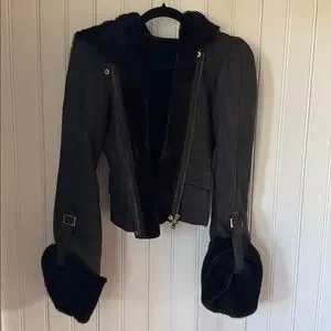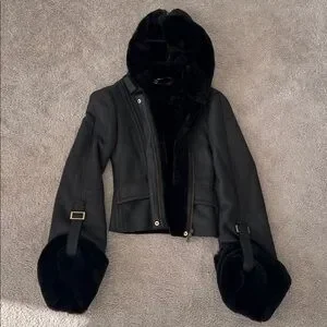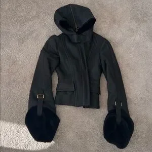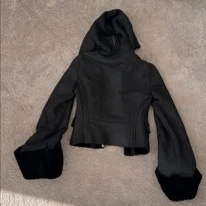 Beautifully fitted motorcycle style with optional hood. Oversized cuff w/detail.