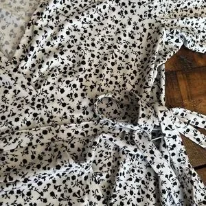 Chic mini dress with black floral print. Soft fabric and wrap style. Perfect for any occasion.