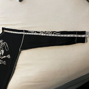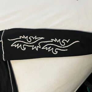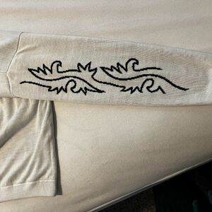 side 1: cream white background with black graphic and stitching; side 2: black background with cream/white graphic and stitching.