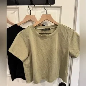 Stylish set of three cropped t-shirts in white, black, and olive. Perfect for casual wear.