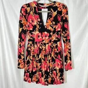 Free People Tegan Black Orange Floral Mini Dress Long Sleeves Keyhole Size 0