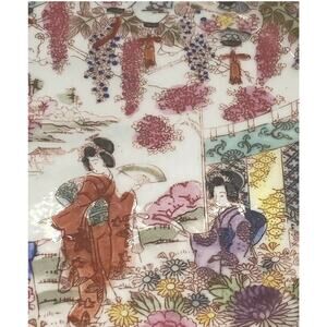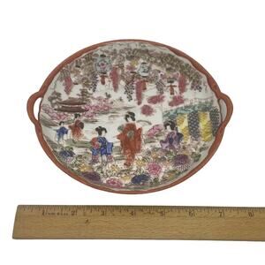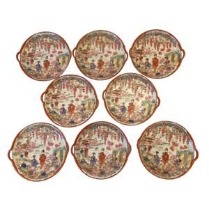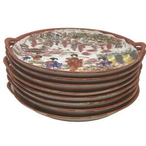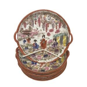 These eight gorgeous hand painted chinoiserie plates are from Japan. Each design shows women with parasols in the garden. Colors are burnt orange, pink, purple, green, light blue and yellow. Each plate is handled and the rims are painted a burnt orange.