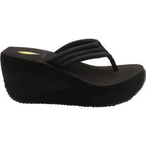 An unworn pair of sporty black wedge sandals from Volatile. Still in the box. "Zoe" style. Cushy support. The foot strap is nylon.