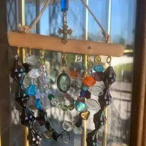 This exquisite iridescent beaded ornament Sun catcherfeatures a stunning array of colors, perfect for enhacing the look of your holiday decor and elevating your space The unique leaf accents add a touch of nature-inspired elegance. This is a one of a kind handmade item which would make a special gift.