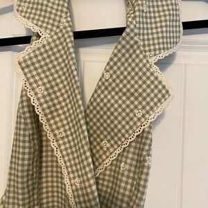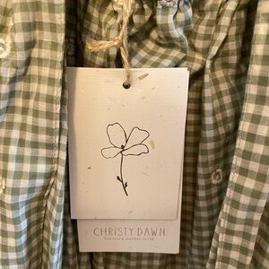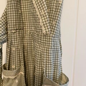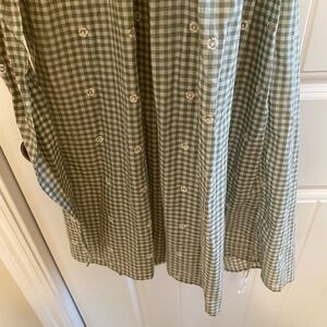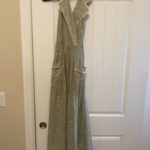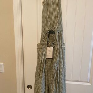 Chic midi dress with a halter neckline. Features a sage gingham pattern. Ideal for casual elegance.