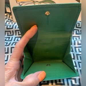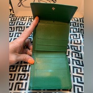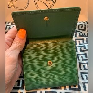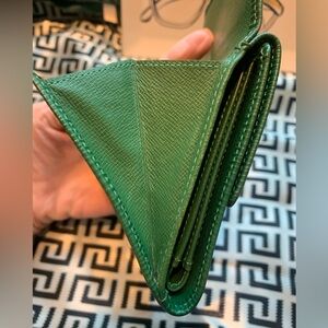 Elegant green wallet with signature LV logo. Textured design adds sophistication. Perfect for daily use.