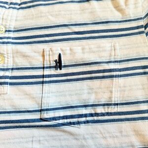 This is a comfy polo perfect for any wardrobe. Soft cotton in striped all over print. Embroidered front chest pocket. Spread collar with four button neckline. Versatile and easy to style. In great used condition with only some light normal wear from washing.