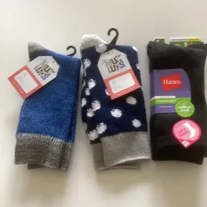 Women’s 8-12 black Hanes-3 pairs; 2 pairs multi-blue/gray Muck Luk’s size 8-10