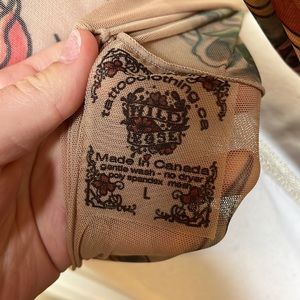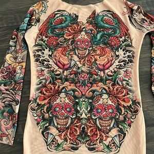 Beautiful sheer tattoo art long sleeve shirt by Tattoo Clothing. Raw edge neckline to blend with skin and not show a seam. Size L with flat, unstretched measurements of — Bust (armpit to armpit) 17” and Length (neckline to hem) 20”. There is a seam on one side of the neck to underarm…but no real definitive distinction of which side is front or back other than this seam….so I’m thinking it could be worn either way. Purchased at a local boutique to use as part of a Halloween costume and never used it. NWT. The colors are fabulous!!!