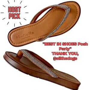 These adorable Mariella Italy sandals are leather, cork & resin and made in Italy. They feature approximately .75 " straps with rhinestones. Perfect condition, slight discoloration were sticker was removed on the inner sole of one of the sandals. These have been stored in closet so bottom coloration is not perfect either. Otherwise perfect! Size 7.5 with measurements of ~~ .5” high, 3.6" at widest point and length (toe to heel) about 10”. In wonderful pre-loved, like NEW condition.