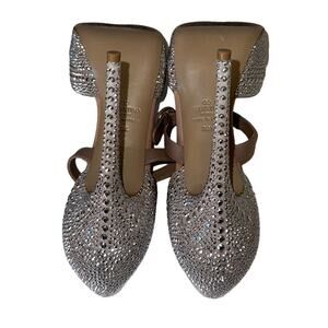 These heels feature a natural beige suede color, d'Orsay silhouette, mary jane buckle strap, peep toe, almond shape toe, approximately 1 inch platform, silver micro studs, and spiked heel. These shoes show some signs of wear such as scuffs on soles, scuffs on inner soles and a couple micro studs on the side of the heel.  Please see pictures for details.  Other then that these heels are in beautiful condition.  Size 39.5.  Original box and dust bag included.