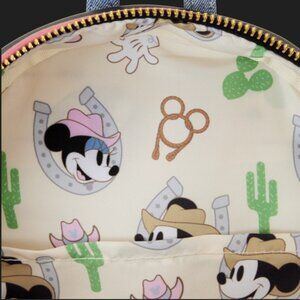 The Loungefly Western Mickey Mouse Cosplay Mini Backpack is made of vegan leather (polyurethane). Bag has adjustable shoulder straps and shiny gold hardware. Additional features include applique, embroidered, denim, molded metal, and printed details. Take note of the coordinating inside lining.