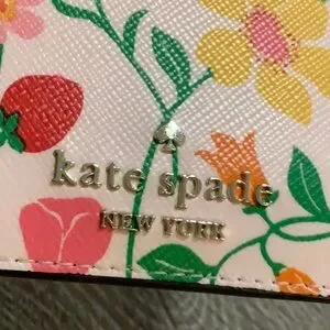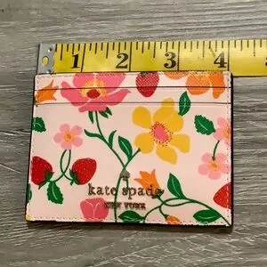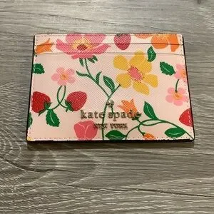 Chic Kate Spade card holder with vibrant floral pattern. Features pink, yellow, and green hues with flowers & strawberries. Holds multiple cards & has a slot on top as well. Gold colored logo on one side. Like new condition.