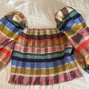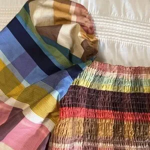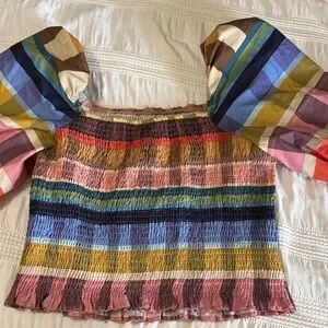 Vibrant top featuring a colorful plaid design. Perfect for fall and adding a pop of color to your wardrobe.smocking bodice.