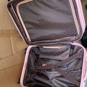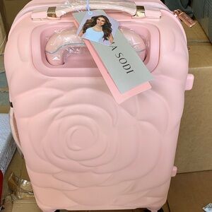 Stylish pink travel bag with floral design. Durable and chic. Easy to maneuver with wheels.