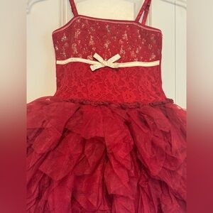 This Emma dress will make your daughter look like she just came out of a fairy tale book! The red dress comes with a pixie-like ruffle skirt and a lacey strappy bodice that has an ivory bow accent across it. Little girls will love twirling round and round in this classy dress.