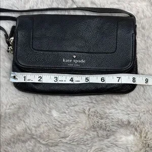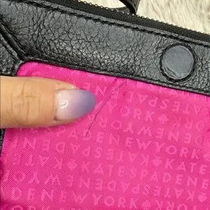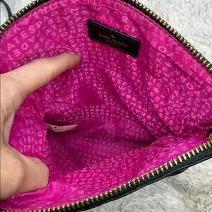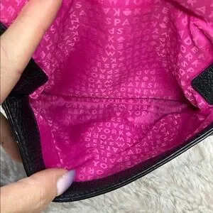 The Kate Spade Mansfield Mariana is a black pebbled leather cross body purse with sliver toned hardware, a single flat shoulder strap (21" drop), an exterior zip compartment flag, a fuchsia logo jacquard lining and a magnetic closure fold-over flap. It has 100% cow leather shell with 100% polyester lining.