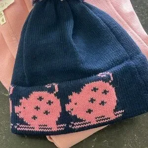 NWOT Stowe Woolens Ltd whimsical Navy Blue Beanie โ Pink Pigs & Pom-Pom