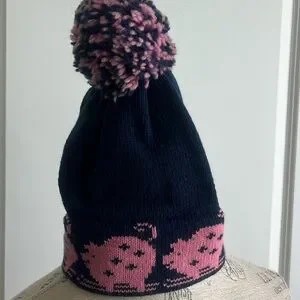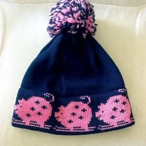 Brand new with tags Stowe Woolens Ltd beanie from Stowe, Vermont. Navy blue knit hat featuring playful pink pig motifs and a fun blue & pink pom-pom. Cozy 100% wool construction keeps you warm while adding a whimsical, charming touch to your winter wardrobe.