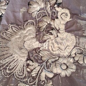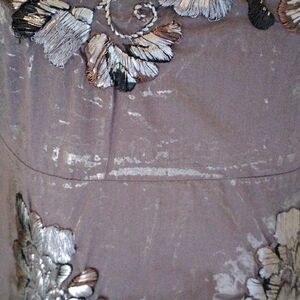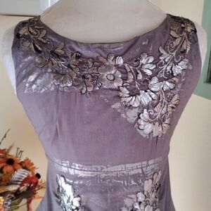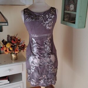Gray fine cotton embroidered with silver threads. Silver graphics. Flowers and leaves around the neckline. Abstract birds on the middle. Flowers embroidered around the bottom. Fully lined , side zip. Size M measures 35 at chest, 30 seam under chest, 31 at waist, 38 at hips, 34 long from shoulder to hem. So different, you'll be the star.