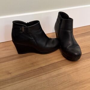 Sleek black wedge ankle boots. Side zipper for easy wear. Comfortable and stylish.