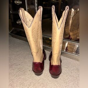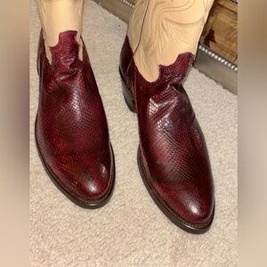 Vintage Justin Men's burgundy and tan water snake boot 12.5 Inch shaft .This boot also features an almond Toe with stacked Heel and Leather Outsole for long wear. Whether out on the town or working on the ranch, you won't go wrong with the purchase of this fine Justin product. Justin Boot Company, makers of fine quality western boots and shoes since 1879.