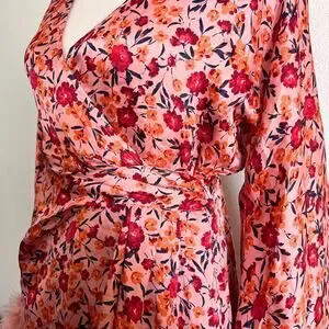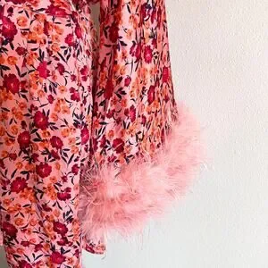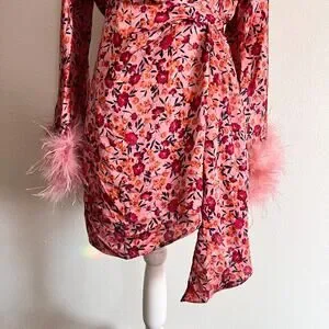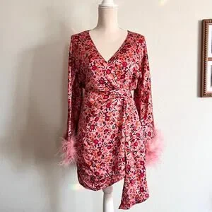 Buddy Love Anisa Feather Cuff Mini Dress in women’s size Small. Fun and bold wrap-style dress with vibrant dragonfruit floral print and dramatic feather-trimmed sleeves — the perfect statement piece for parties, events, or date nights.