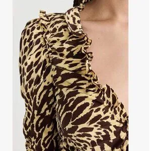 The Marcie Dress is crafted from our stretch silk fabric in an abstract leopard print. This mini silhouette features a ruffle-adorned plunging V-neckline, lightly puffed sleeves, delicate ruching, and a slightly curved hemline. Dry clean. Imported.