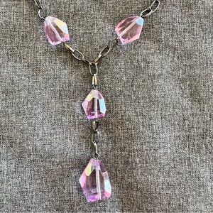 Women's Silver Tone Necklace 6 Large Pink Clear Crystal Beads 16 Inches Vintage