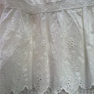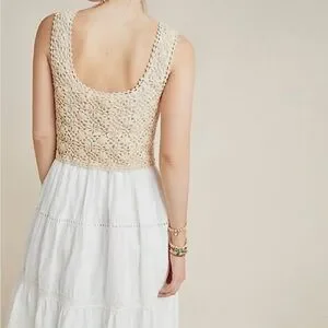 The Beckett crochet dress is the perfect summer dress. Fully lined with a crocheted overlay and a tie waist. Gorgeous scalloped eyelet hem. Size S