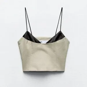 V-neck crop top with contrasting satin effect straps. Side zip closure.