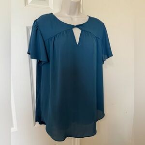 This elegant teal blouse offers a stylish and comfortable fit, perfect for any occasion. Its soft fabric and unique design make it a must-have in your wardrobe. I bought this from stitch fix. I wore it once. The front is 100% polyester and the back is t-shirt material. The sleeve are split sleeve. See pictures for details. Smoke/animal free. Quick shipping. I am Cleaning out my closet.