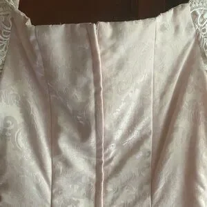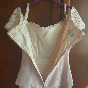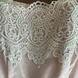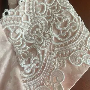 Worn a few times to weddings. The color is peach/light pink and the lace is an off white.
