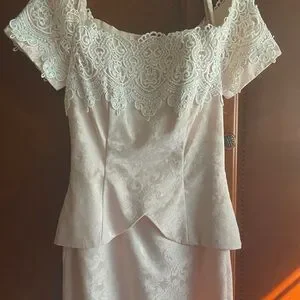 Elegant vintage midi dress with delicate lace bodice. Features short sleeves and a fitted silhouette. Perfect for weddings or any special occasion.
