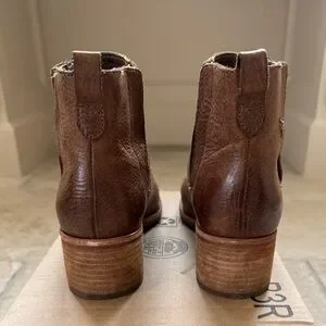 Elegant tan leather booties with a sturdy block heel. Perfect for versatile styling.