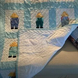 Charming quilt featuring farmer appliqué designs. Soft blue and white tones with colorful accents.