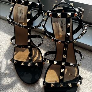 Authentic Valentino Garavani Rockstud sandals in sleek black patent leather with signature gold pyramid studs.