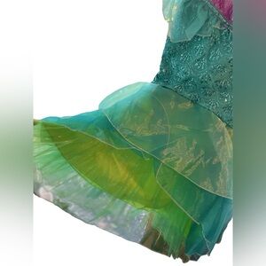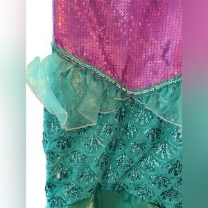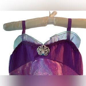 Beautifully detailed, iconic Ariel costume dazzles with a silvery jeweled brooch, fanciful undersea foliage, iridescent sequins, tiers of fishtail tulle and glittering trims