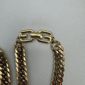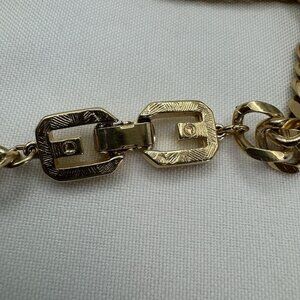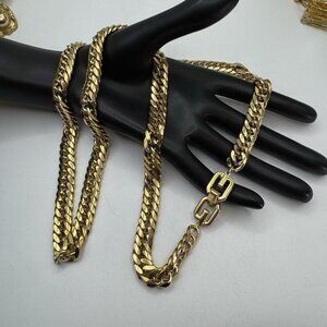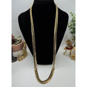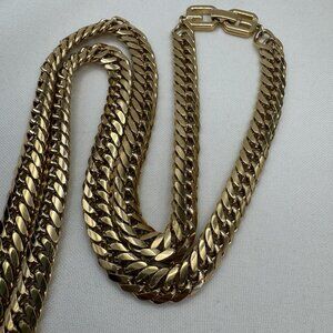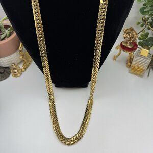 This vintage gold-tone necklace features a luxurious, chunky flat curb chain design with a rich, polished finish. Its designer-style look exudes elegance and sophistication, making it perfect for statement wear. Though unsigned, this piece has a high-quality feel and weight, ideal for those who appreciate timeless fashion.