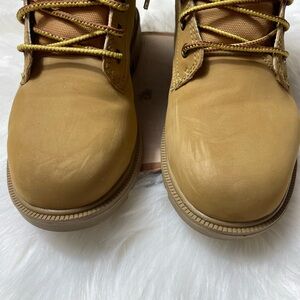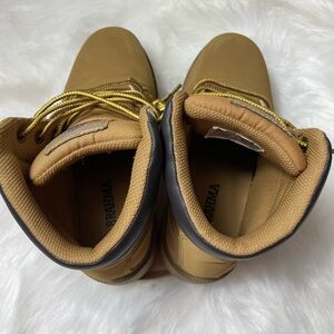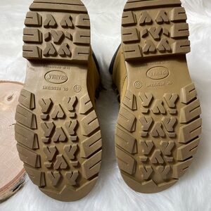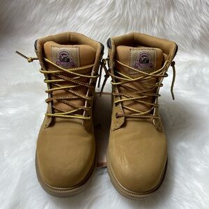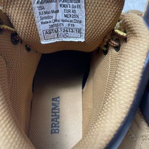 Brahma steel toe work boots. Size 8.5. Khaki tan. 6” laced upper. Synthetic lining, low heel height. Round toe. Slip and oil resistant rubber outsole. Padded collar. EUC, very clean except for scuffs on toes.