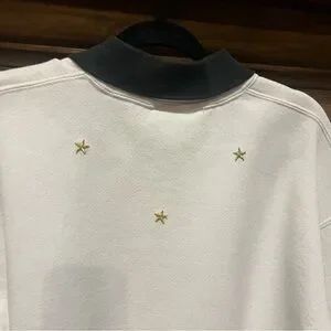 Features embroidered gold stars