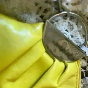 Keywords: women's clutch, faux leather, yellow clutch, zip closure, metal ring accent, silver hardware, evening bag, casual clutch, pre-owned, spacious clutch, secure closure, women's accessory, fashion clutch, stylish bag, elegant clutch.